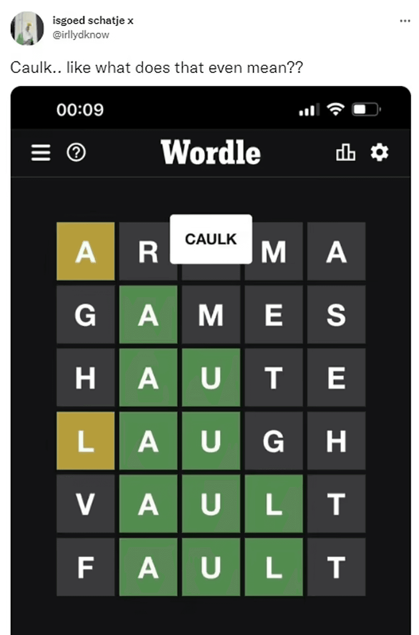 Here are some user reactions to when the wordle answer on February 16, 2022 was CAULK